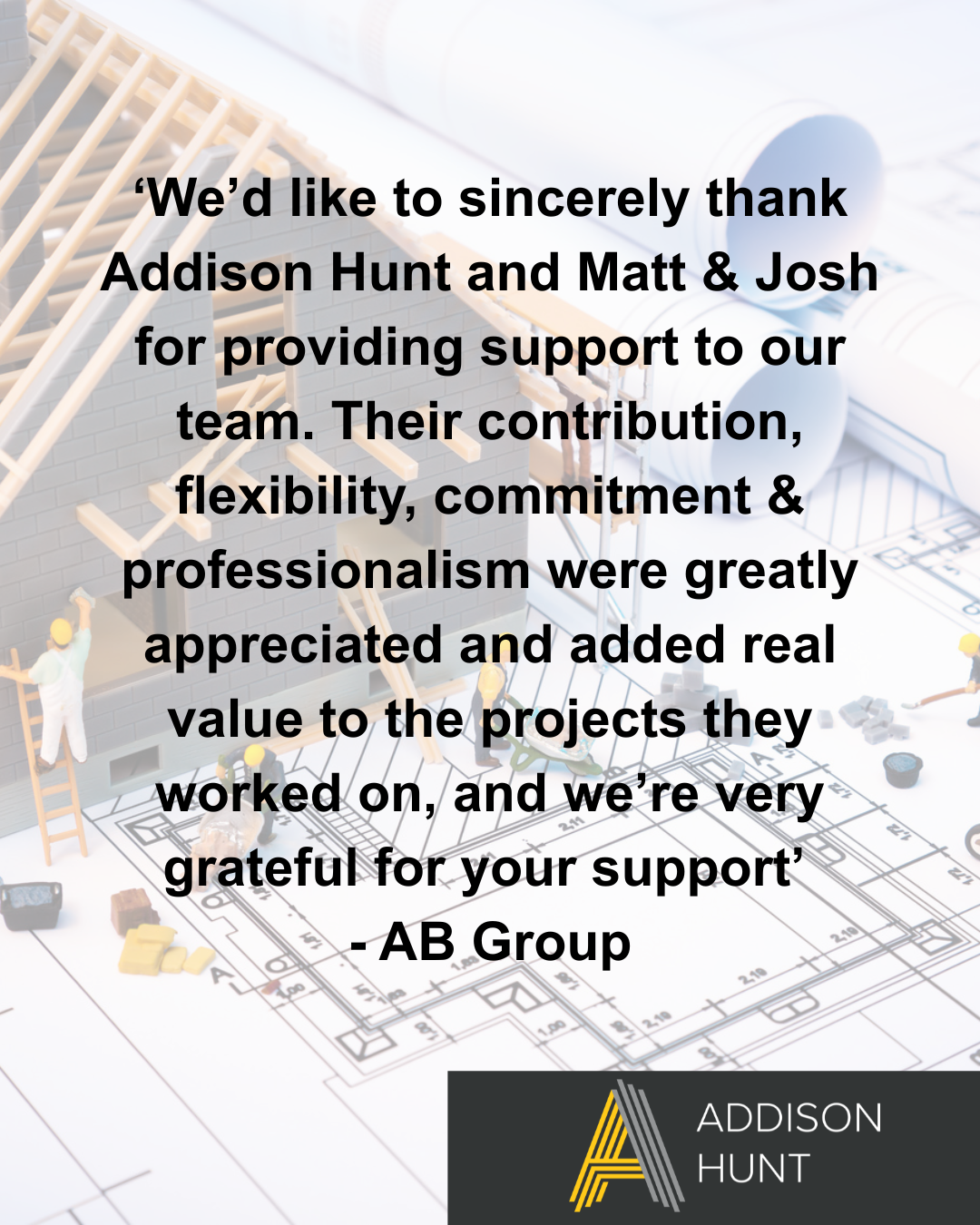 We always appreciate when we get great feedback from clients that we have supported – AB Group! Addison Hunt provide Estimating and Quantity Surveying support to a number of contractors. Get in touch for an informal conversation about our capabilities and experience to see how we could support your business.